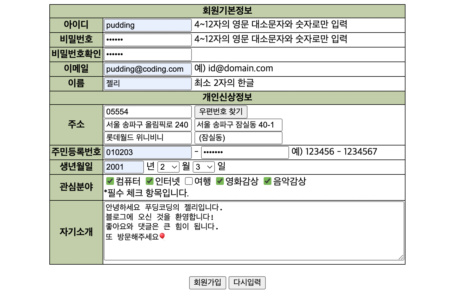아래는 정규표현식을 사용하여 홈페이지의 회원가입 폼에 대한 유효성검사를 구현한 페이지입니다.