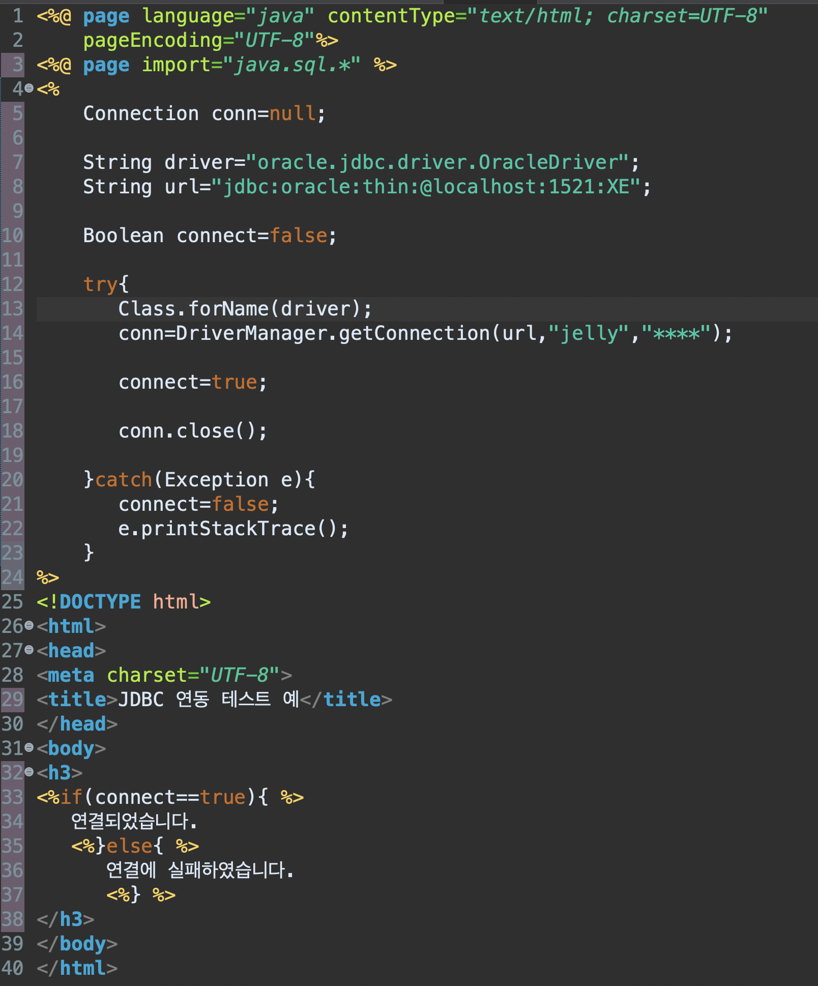 [33~34] Java tag를 이용해 connect가 true일 때, 즉 DB와 연결이 되면 홈페이지에 연결이 되었다고 표시해줍니다.