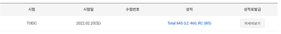 2년 반 전 치른 시험보다 한 10점 오른..ㅋㅋㅋㅋㅋ 845ㅎ..