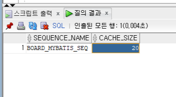 cache size를 확인하는 쿼리: SELECT SEQUENCE_NAME, CACHE_SIZE FROM USER_SEQUENCES WHERE SEQUENCE_NAME='BOARD_SEQ'