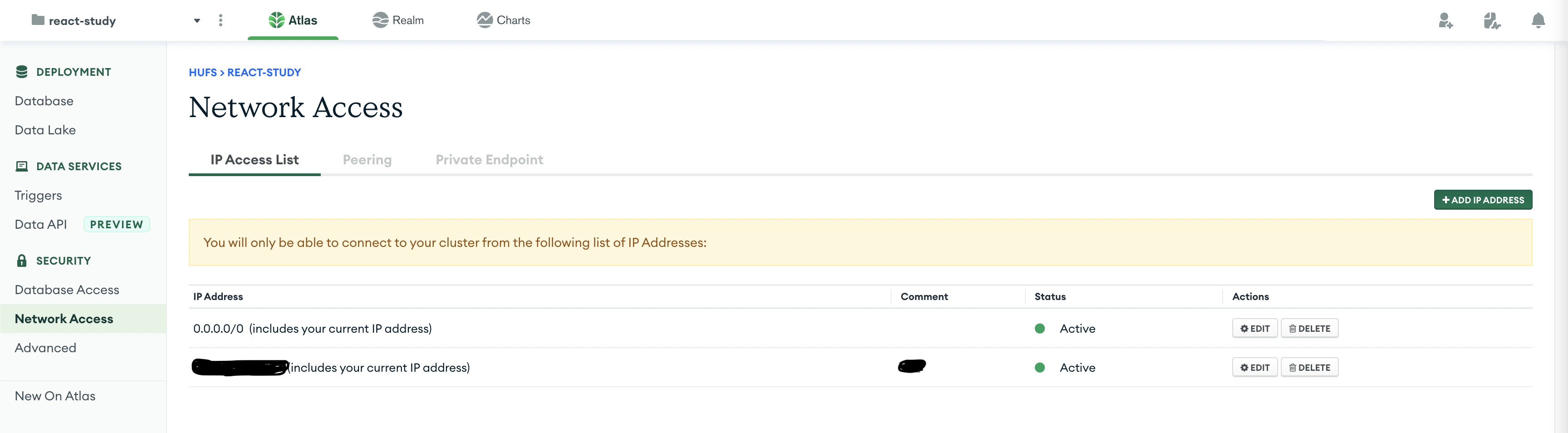 2. 몽고DB Ip access list를 수정해볼 것 : mongoDB에서 network access에 설정해둔 ip를 지우고 다시 잡아볼 것. ( 나는 이 경우로 해결했다)
