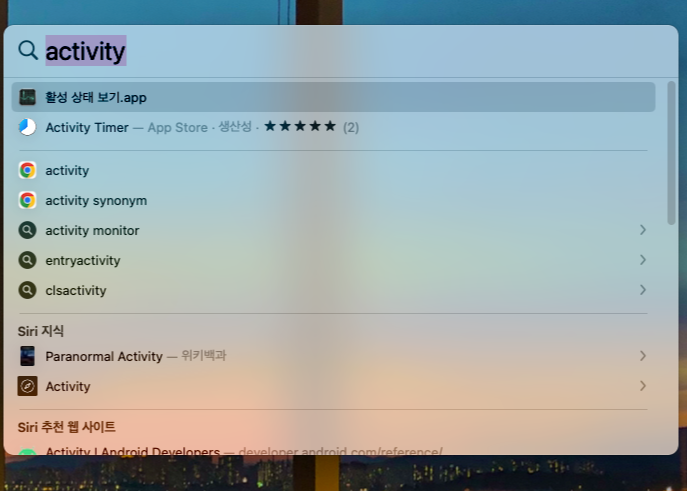 '활성 상태 보기' 또는 activity를 검색하여 app을 열어준다.