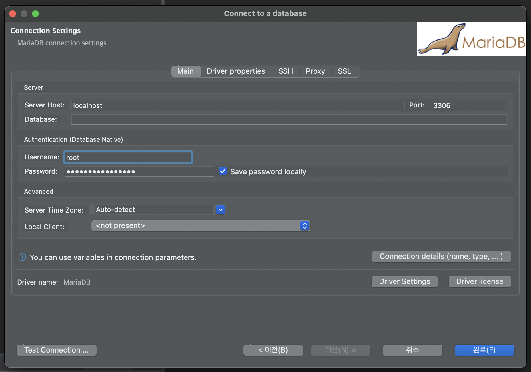 이미 mariaDB에서 세팅이 된 계정과 비번을 입력해주고 완료를 누른다.
