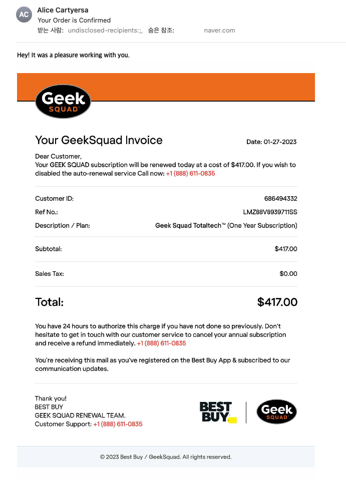 얼마 전 내 naver메일로 geek squad라는 곳에서 Invoice를 보내왔다.